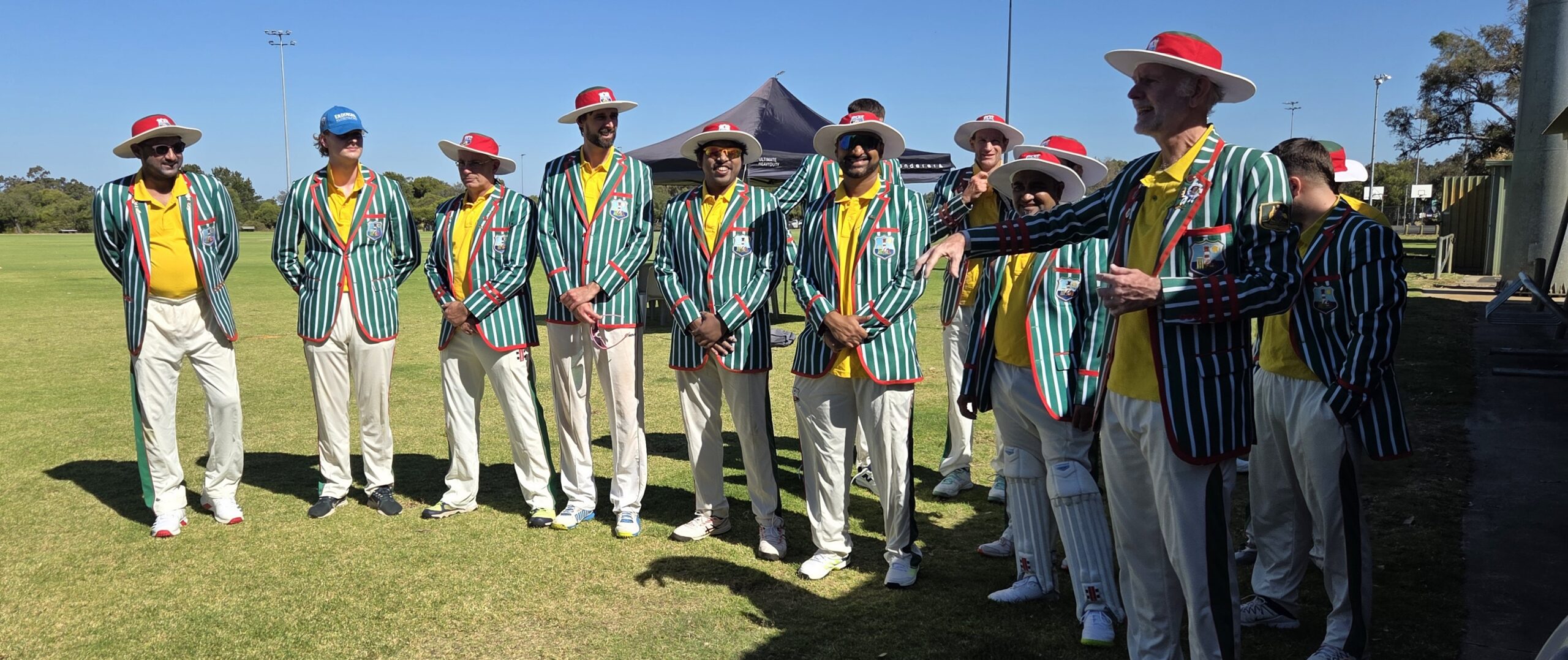 Before the match, the Pilgrims were presented with a quandary absent from the previous four matches. With a squad of 14 (semi-fit) players, two needed to sit out. After some discussion and horse-trading, Dev and Ankit very kindly raised their hands. Ankit went further, by umpiring the whole match, suitably dressed in a golden tour shirt and his club blazer, while Dev assisted with scoring and drinks, and was the team’s number one fan. Full credit to both of these fine Pilgrims.
